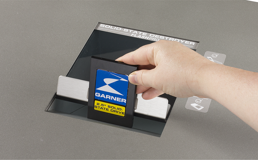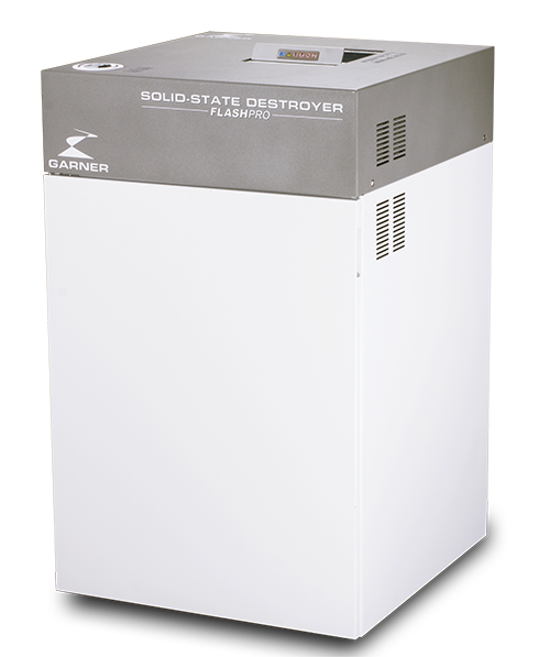 A high-volume shredder specifically designed for an office environment, the FLASHPRO shreds a wide variety of media including smartphones, mini-tablets (up to 170 mm in width), USB sticks, solid-state drives (SSD), and optical media. Add Garner's exclusive IRONCLAD Destruction Verification System to the FLASHPRO to capture images of the media prior to shredding and generate destruction reports for audit or archival purposes.