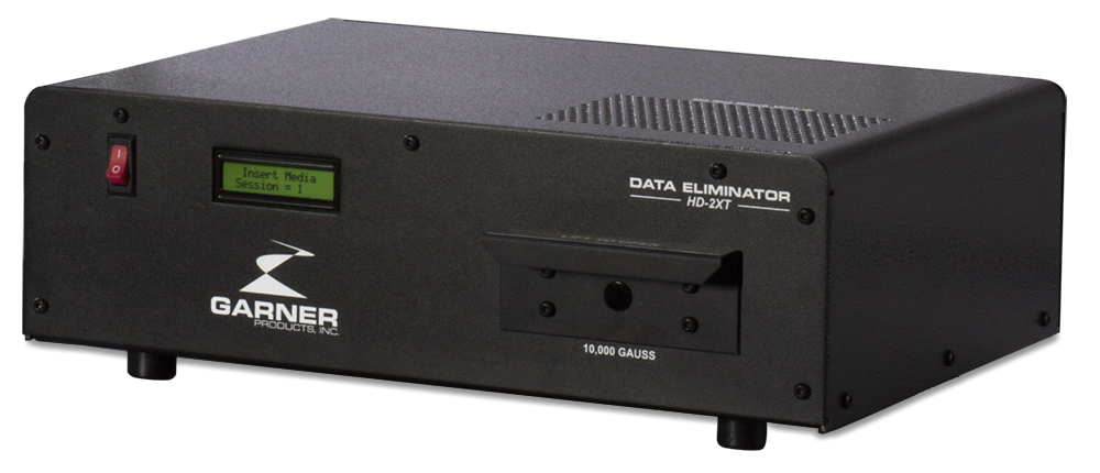Garner’s HD-2XT automatic degausser magnetically destroys all data on hard drives and tape in 8 seconds, verifies the erasure field strength, and numerically displays the gauss level after each cycle.
