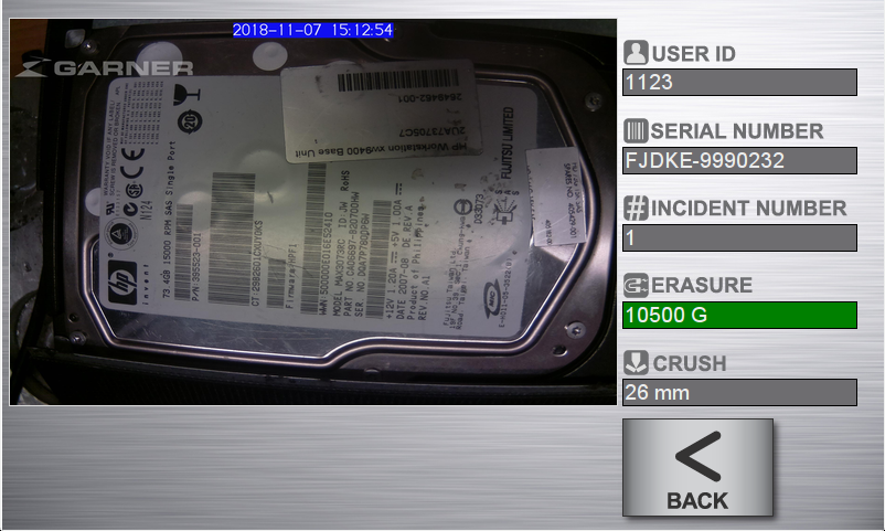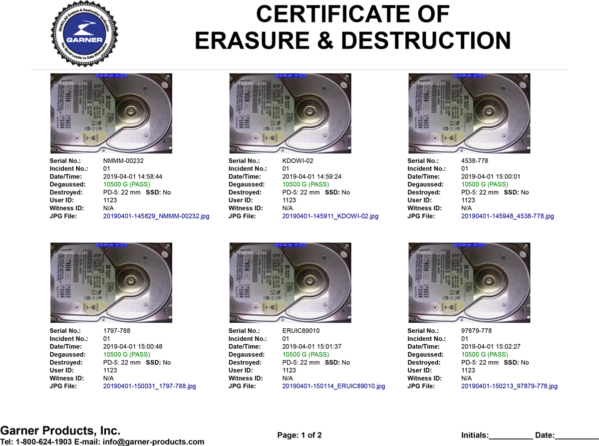 Garner's exclusive IRONCLAD Erasure and Destruction Verification System automatically captures a JPG image of the hard drive immediately after it is degaussed and generates an exportable proof-of-destruction certificate for audit and archival purposes.