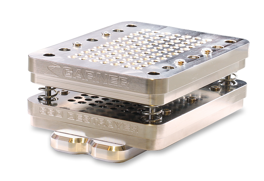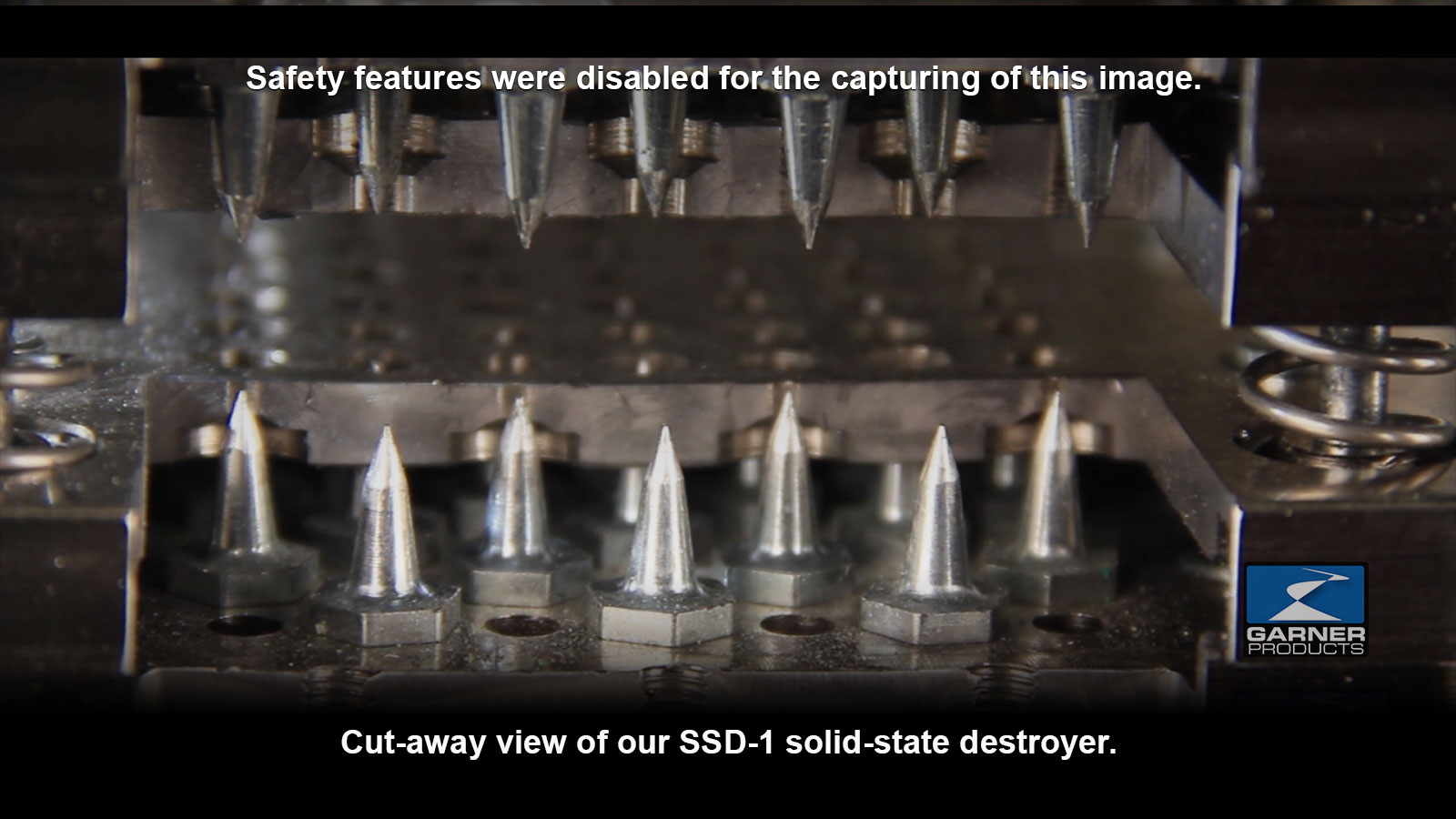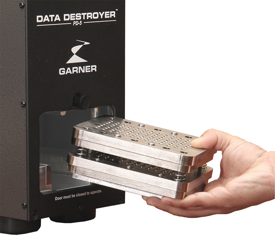Create the ultimate destruction package by adding solid-state destruction capability to your PD-5. Garner's patented SSD-1 ensures secure destruction of data stored on solid-state media, flash thumb drives, and SSHD (solid-state hybrid drives) controller boards.