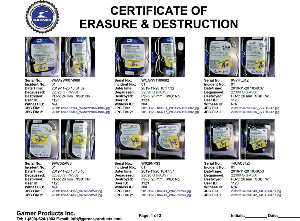 Garner's exclusive IRONCLAD Erasure and Destruction Verification System automatically captures a JPG image of the hard drive immediately after it is degaussed and generates an exportable proof-of-destruction certificate for audit and archival purposes.
