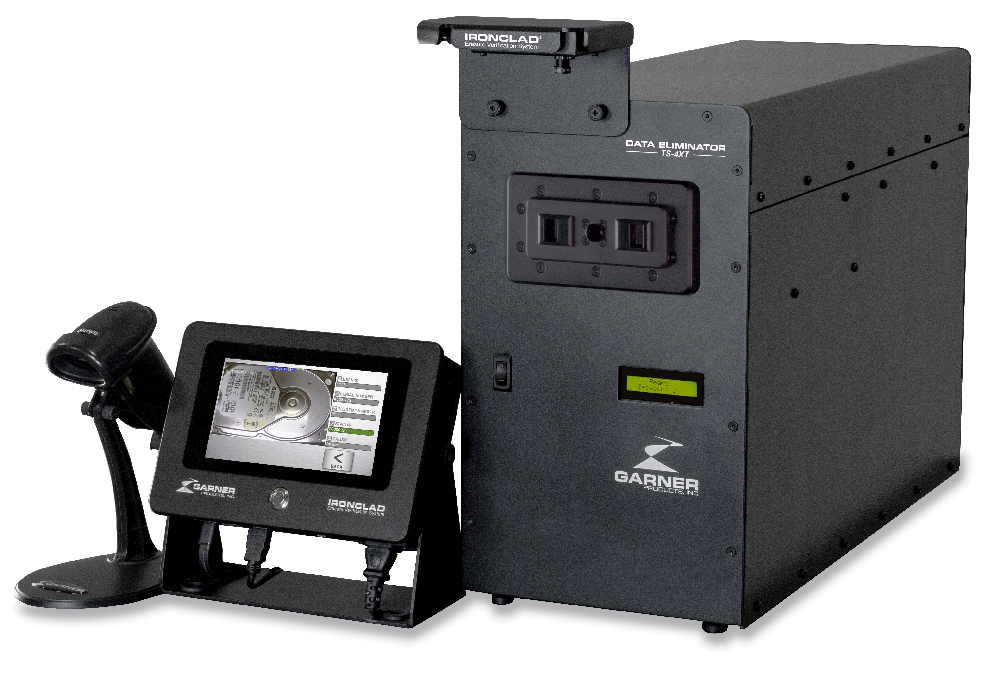 Garner's TS-4XT is the only 40,000+ gauss (4+ tesla) degausser equipped with IRONCLAD, a proof-of-erasure system that automatically generates an erasure report that includes an image of the hard drive for each hard drive as it is degaussed. With a 40,000+ gauss field, the TS-4XT completely erases all data on hard drives and tapes in under ~30 seconds.